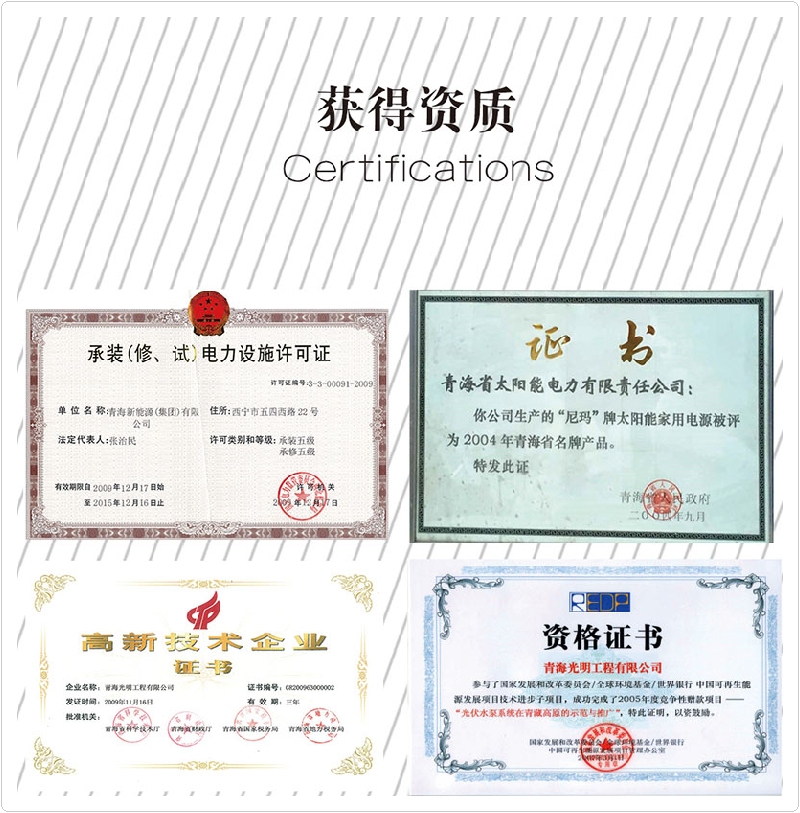 公司先后榮獲“全國專利先進科技研究院”、“全國各族青年團結(jié)進步集體”、“青年文明號”,“青海省模范集體”,“全國教科文衛(wèi)系統(tǒng)先進工會組織”、全省“學(xué)習(xí)型組織標(biāo)兵”單位、全國“創(chuàng)新性試點企業(yè)”、連續(xù)三年被中國農(nóng)業(yè)銀行青海分行授予“AAA信用企業(yè)”和“AAA優(yōu)良客戶”等榮譽稱號。公司擁有“尼瑪”牌太陽能。